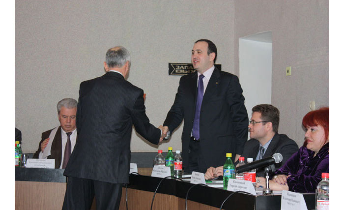 На первом заседании Думы 5-го созыва. Старейший депутат Волгодонской городской Думы С.Л. Шерстюк приглашает вновь избранного председателя Думы П.П. Горчанюка занять свое место во главе стола в зале заседаний.