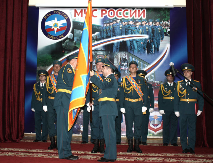 Под барабанную дробь начальник Главного управления МЧС России по Ростовской области Валерий Синьков передал знамя руководителю учебного центра Александру Левченко и попросил беречь его, как реликвию.