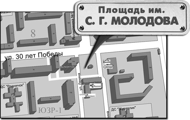Память о своем друге и сослуживце решили сохранить десантники, оставшиеся жить в Волгодонске. Владимир Юрьевич Трушин, ветеран воздушно-десантных войск, участник боевых действий, сослуживец и друг Сергея Молодова, вышел на городскую власть с предложением увековечить память воинов-десантников 6-й роты и их командира. 13 октября 2000 года появилось постановление главы города С.В. Горбунова. В его содержательной части необычно звучал такой пункт: «Работы по благоустройству площади и установке обелиска Героя России «Комплексжилстрой» (Трушин В.Ю.) за счет собственных средств». Вот так в нашем городе на месте заброшенного пустыря появилось красивое место, где собираются, чтобы почтить память не только героев-десантников, но и всех волгодонцев, погибших при выполнении воинского долга.