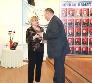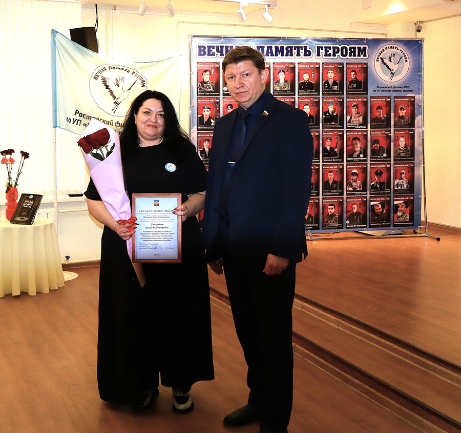 Председатель Волгодонской городской Думы-глава города Волгодонска Сергей Ладанов вручил благодарственное письмо руководителю Ростовского филиала межрегиональной организации «Вечная память героям» Елене Телегиной – за сохранение памяти о подвигах защитников Родины.