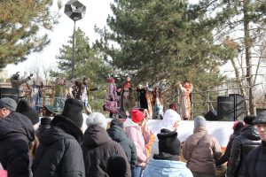 На главной масленичной площадке развернулась яркая концертная программа: ведущие коллективы города закружили всех гостей в вихре песен и плясок. Леди Фуршет щедро одаривали прохожих угощениями, скоморохи развлекали толпу шутками да прибаутками, а ведущие, как настоящие сказители, знакомили жителей с масленичными традициями.