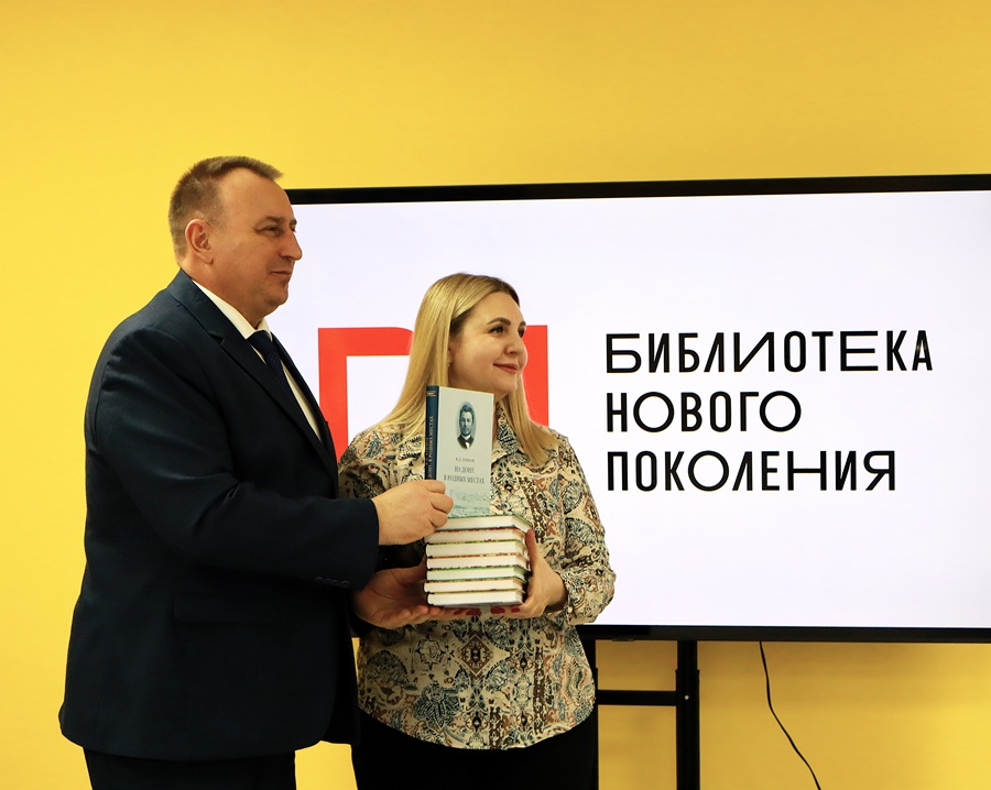 Перед просмотром председатель Волгодонского отделения общества, глава администрации Волгодонска Юрий Мариненко передал в дар центральной модельной библиотеке собрание сочинений Федора Крюкова.