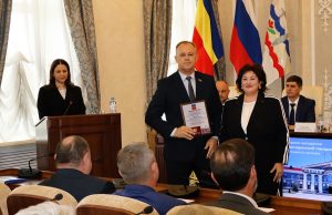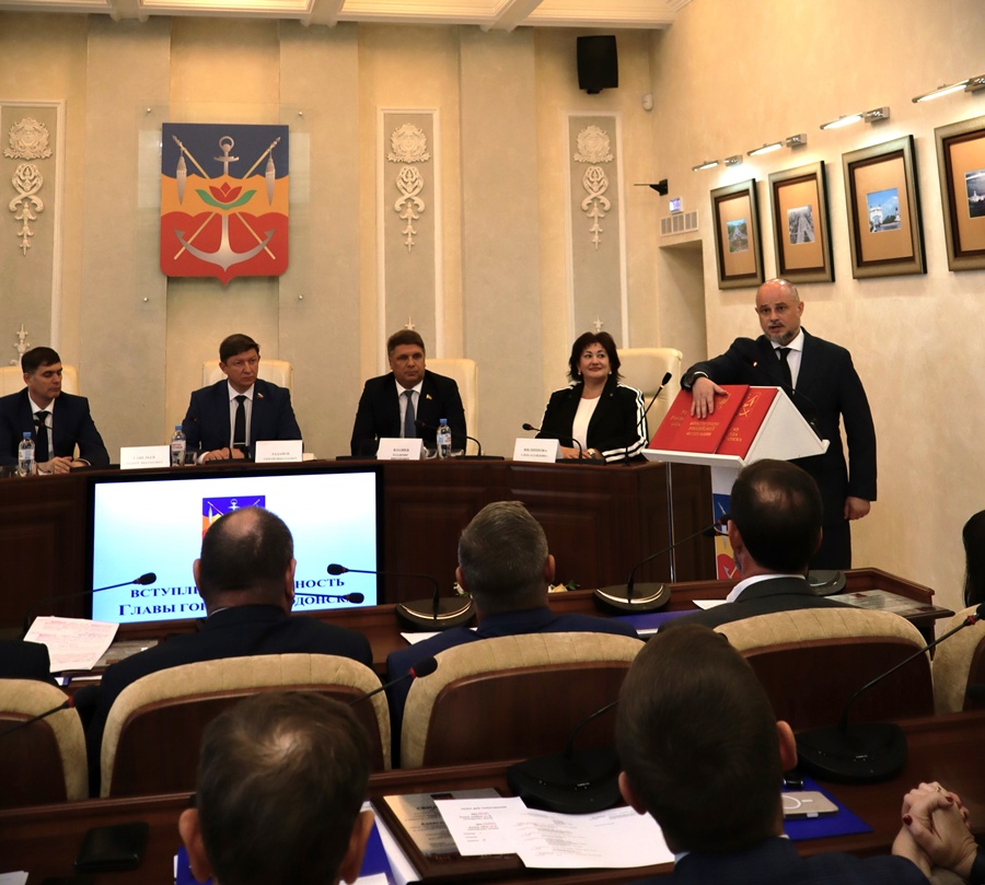 Затем состоялось утверждение на должность главы города Волгодонска Дмитрия Вельможко. По итогам конкурса он набрал наибольшее количество баллов, а за период временного исполнения обязанностей главы муниципалитета успел зарекомендовать себя как грамотный и ответственный руководитель. Дмитрий Юрьевич принес клятву на Конституции РФ, уставах донского региона и города, подтвердив свою готовность приложить все силы к развитию Волгодонска.