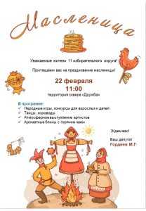 22 февраля депутат округа Гордеев Михаил Геннадиевич, приглашает всех жителей 11 избирательного округа на праздничное мероприятие «Масленица»!!!