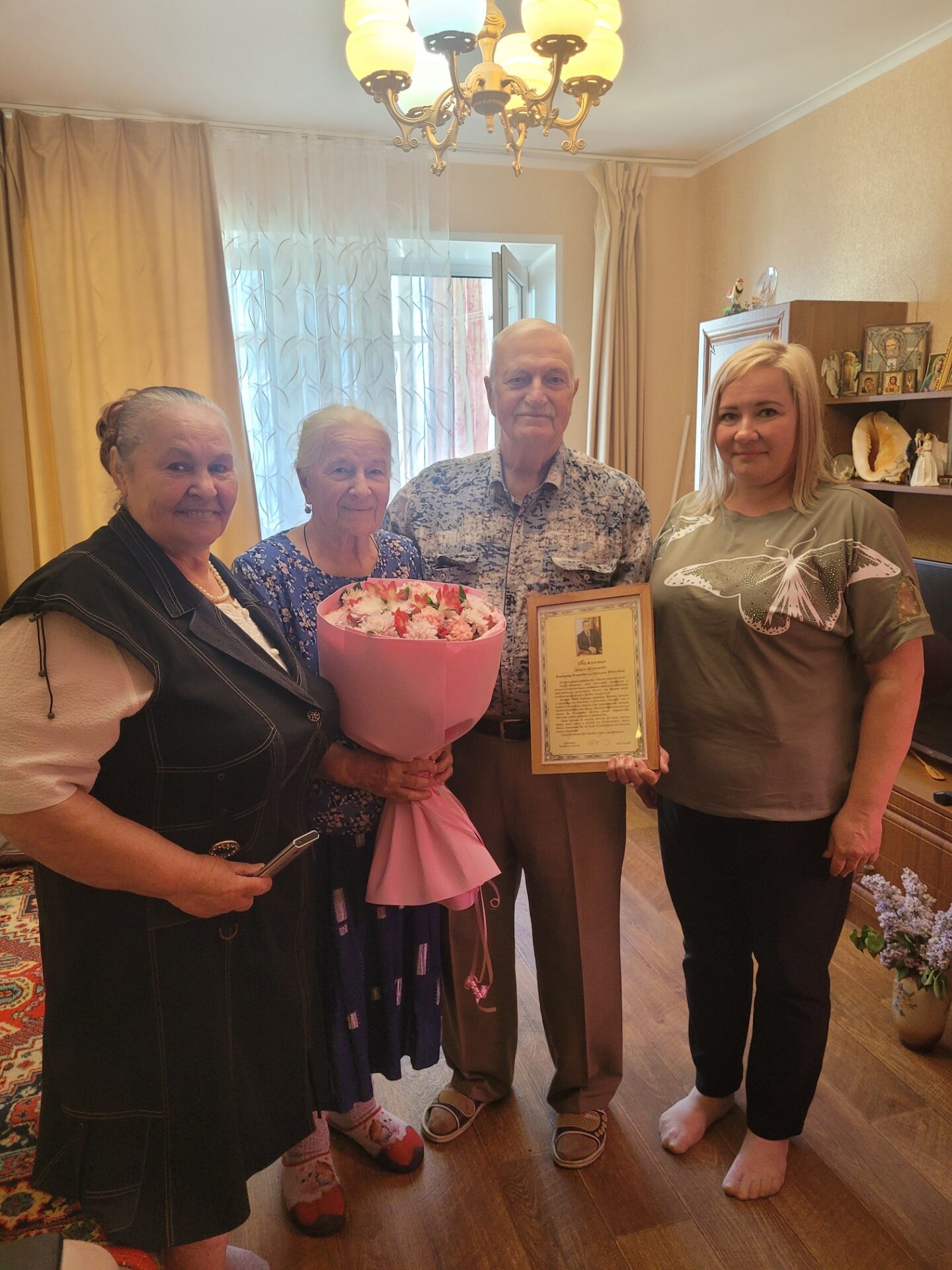 Поздравить юбиляров с такой значимой датой пришла депутат Волгодонской городской Думы по избирательному округу № 20 Радыгина Тамара Сергеевна. Тамара Сергеевна пожелала супругам крепкого здоровья и долголетия, радости и душевного спокойствия, любви и гармонии в семье, вручили приветственный адрес  от Губернатора Ростовской области Василия Юрьевича Голубева, цветы и подарки.