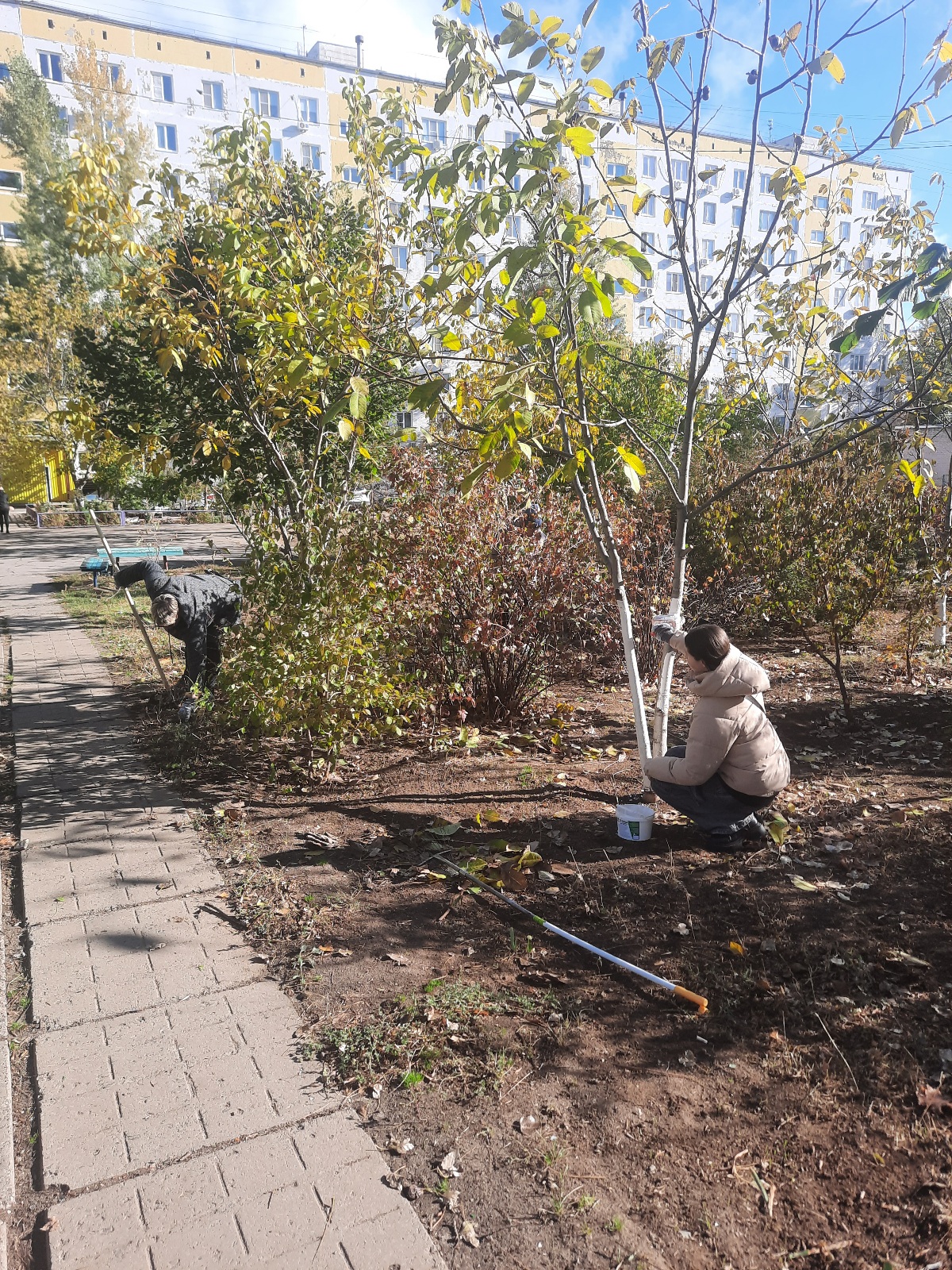 Дружно разобрав рабочий инвентарь, жители округа убрали опавшую листву и мусор, побелили деревья.