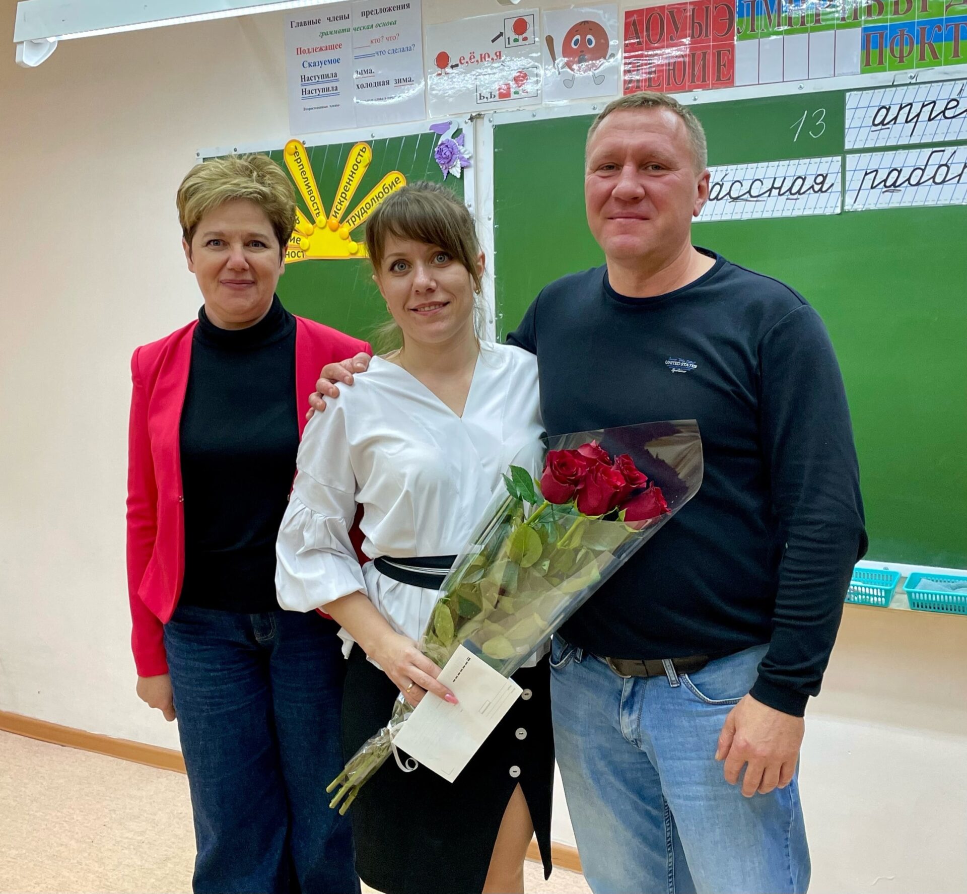 Сергей Александрович пришел поздравить педагога Елену Александровну во время перемены в присутствии ее маленьких учеников и сказал ребятам, чтобы они гордились своим учителем, поддерживали ее и помогали. От себя Сергей Александрович вручил Елене Александровне букет роз, подарок и пожелал творческих успехов, хороших учеников и дальнейшего профессионального роста в такой нужной и важной профессии, как учитель.