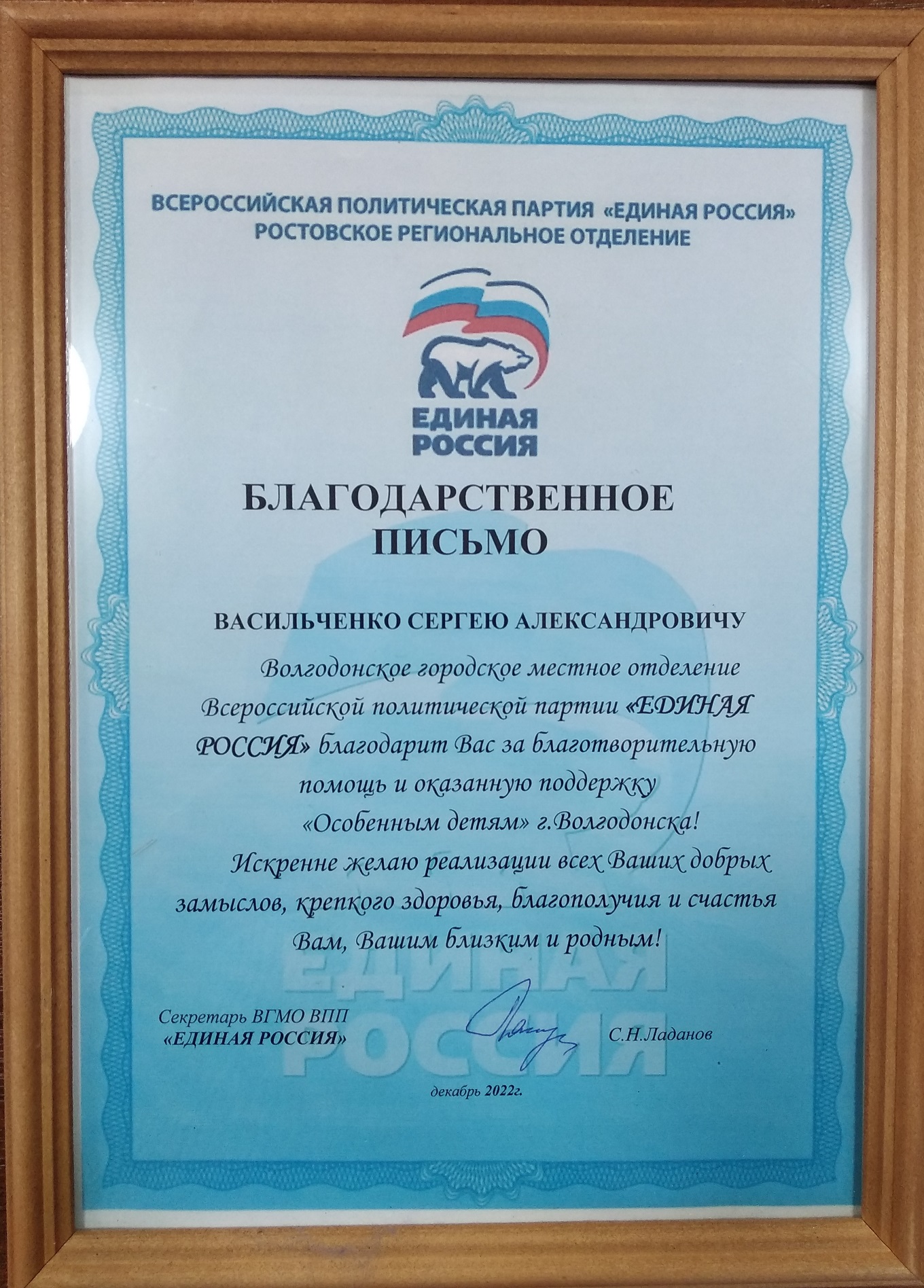 8 декабря в ДК «Октябрь» состоялся праздник для «Особенных детей»: «Мы учимся жить вместе, и у нас получается!». На мероприятии вручено благодарственное письмо депутату избирательного округа №9 Сергею Васильченко от Волгодонского городского местного отделения Всероссийской политической партии «Единая Россия» за благотворительную помощь и оказанную поддержку «Особенным детям» г. Волгодонска!