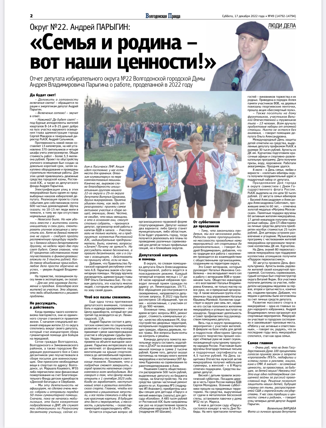 Отчет депутата избирательного округа №22 Волгодонской городской Думы Андрея Владимировича Парыгина о работе, проделанной в 2022 году.