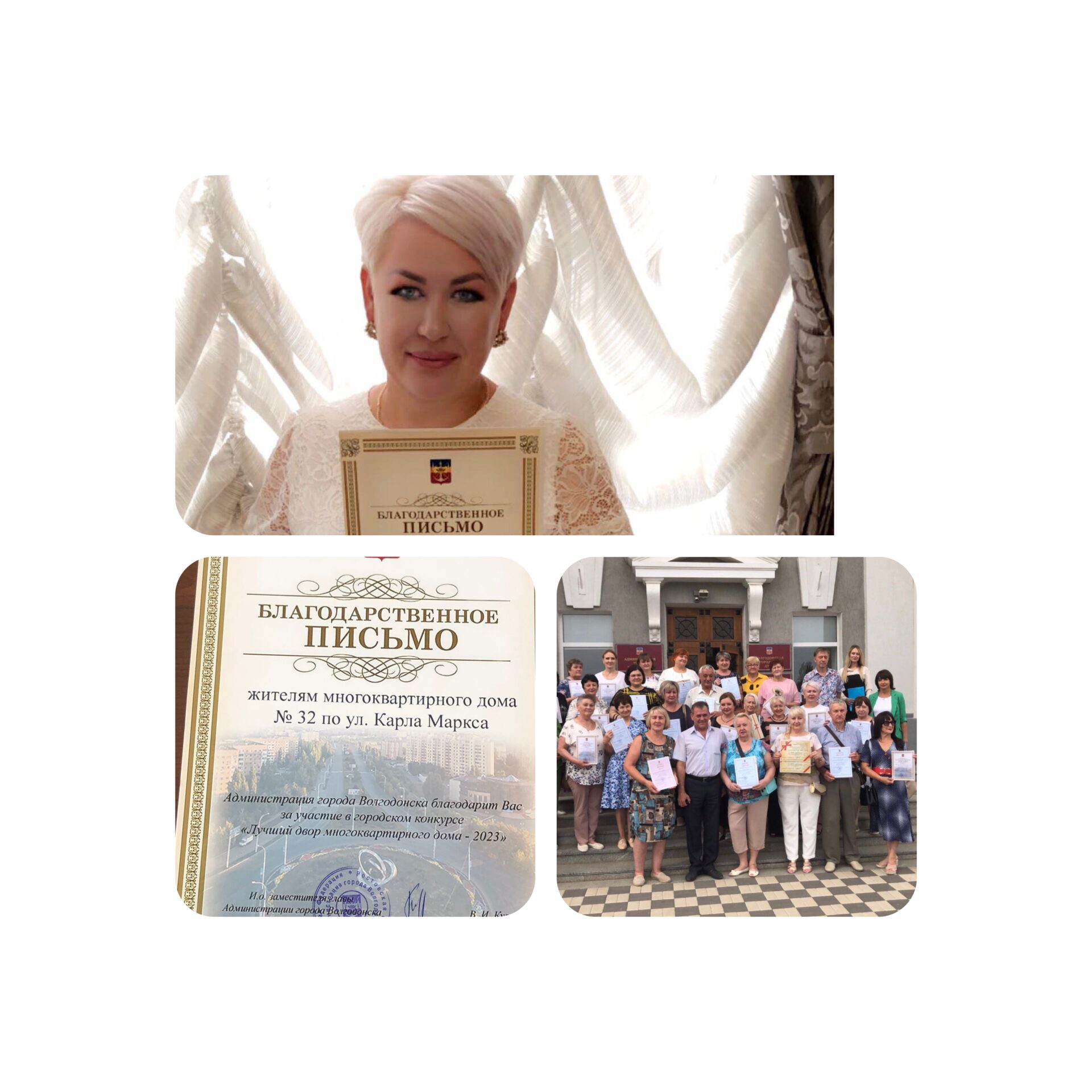 В Волгодонске прошел конкурс « Лучший двор». Микрорайон 22 принял активное участие в этом конкурсе. Пусть не победа, пусть участие! Но! Мы будем идти к лучшему ! Есть результат! МКД ул. К. Маркса ,32 получили благодарность за участие. Главное не победа , главное участие!!!! Мы! Возьмем главный приз! Есть будущее! Учиться надо на ошибках. Все впереди!)