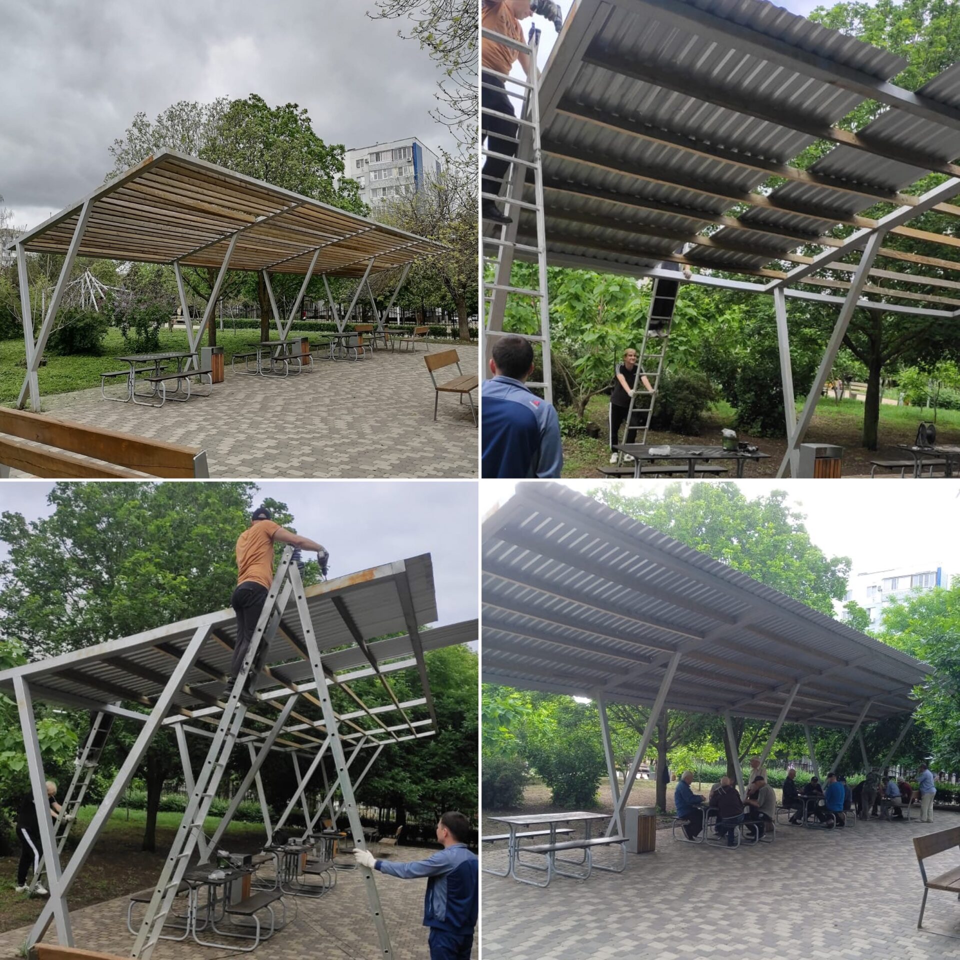 По просьбе жителей 12-го избирательного округа в сквере «Дружба» отреставрирован навес над шахматными столами. Навес в виде перголы закрывал любителей провести время за шахматной доской от солнца, но не защищал их от дождя.