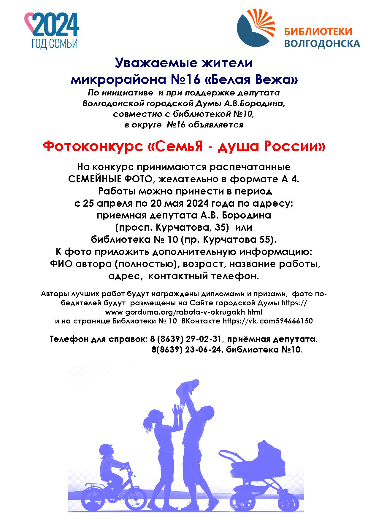 2024 год Президентом Российской Федерации объявлен Годом Семьи. В целях популяризации крепких и дружных семей в округе 16 при активной поддержке депутата избирательного округа Бородина Алексея Владимировича, совместно с библиотекой 10, проводится конкурс семейной фотографии «Крепкая СемьЯ — душа России».